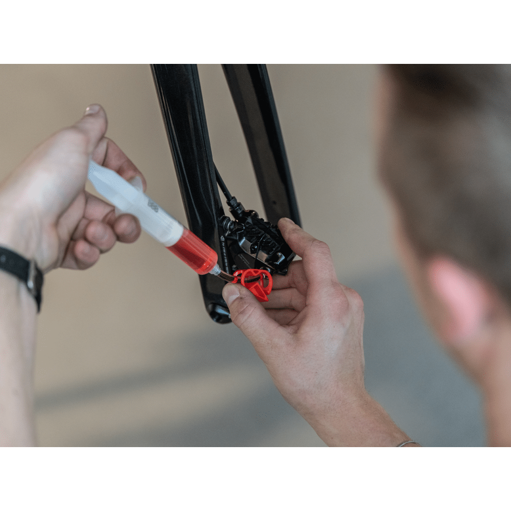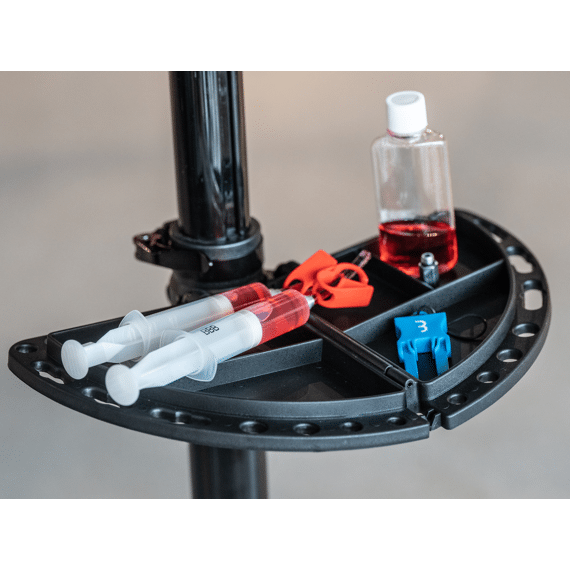 De complete set bevat professionele spuiten met verschillende formaten, passende slangen, adapters voor Shimano connecties, een opvangbakje voor overtollige olie en alle kleine onderdelen die je nodig hebt voor een succesvolle ontluchtingssessie van je schijfremmen.