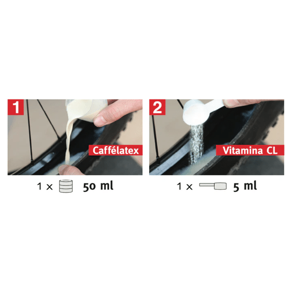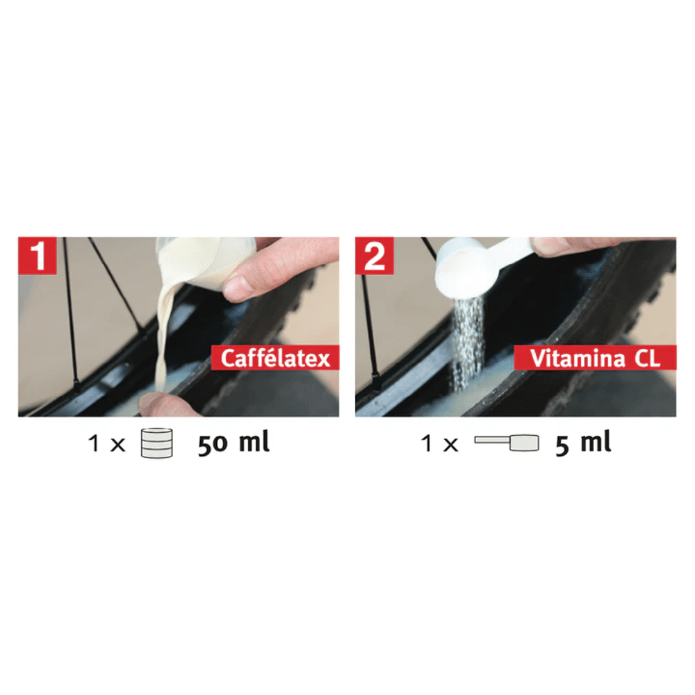 Vitamina CL wordt direct in je tubeless band toegevoegd en mengt zich daar met je bestaande Caffélatex sealant. Het additief versterkt de afdichtende eigenschappen van Caffélatex door de formule te optimaliseren voor grotere puncturen. Wanneer een lek ontstaat, werken Vitamina CL en Caffélatex samen om de opening sneller en effectiever te dichten. Het resultaat is een betrouwbaardere tubeless setup die je vertrouwen geeft, zelfs in de meest uitdagende omstandigheden.