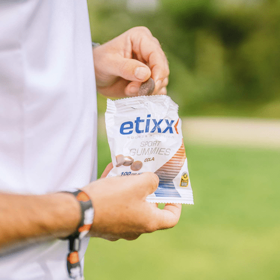 - Inspanningen 1-2 uur: 30 gram koolhydraten per uur (1 zakje Etixx Sport Gummies).