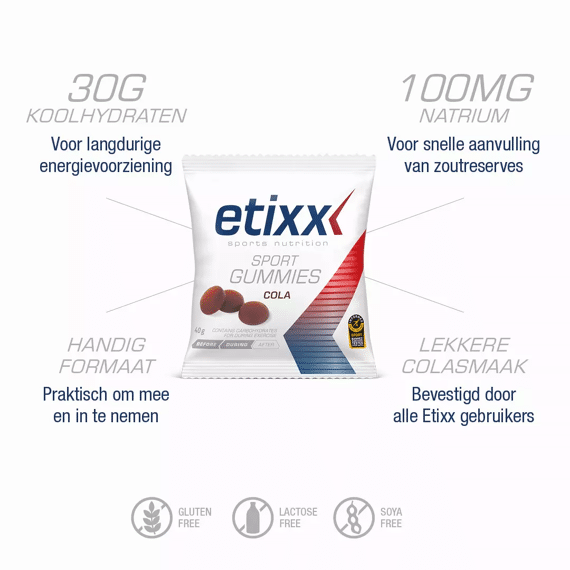 De Etixx Sport Gummies zijn ontworpen om de inname van koolhydraten eenvoudig te doseren en bieden een heerlijke colasmaak. Elke zakje levert 33 gram koolhydraten, ideaal voor het snel aanvullen van energiereserves tijdens inspanningen. Met extra natrium (100 mg) helpen ze ook om het zoutverlies te herstellen.