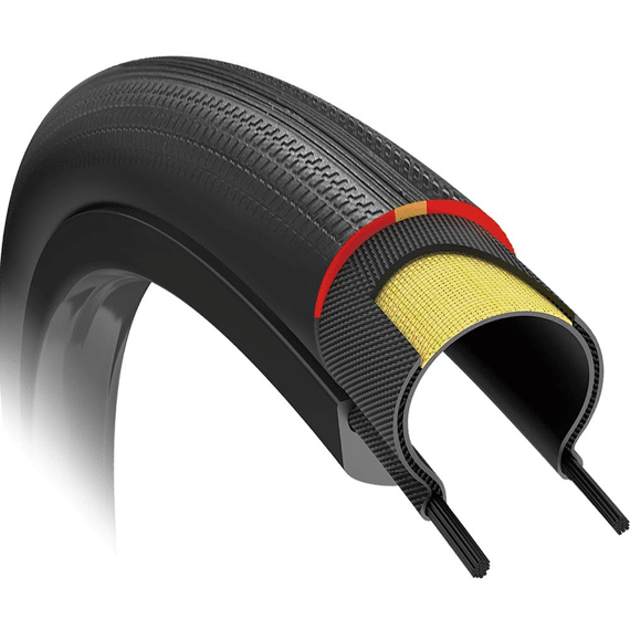 - Carbon/Kevlar composite hieldraad houdt de band stevig op de velg en weerstaat probleemloos de hogere druk van racebanden
